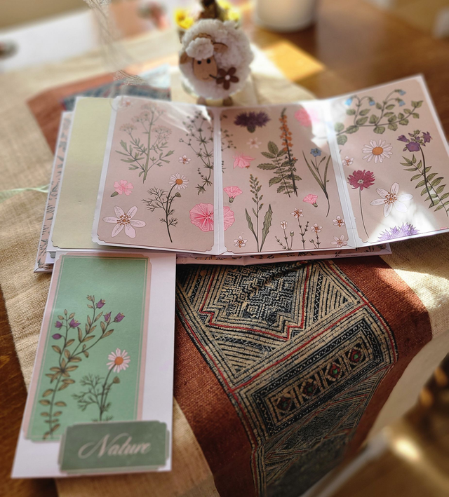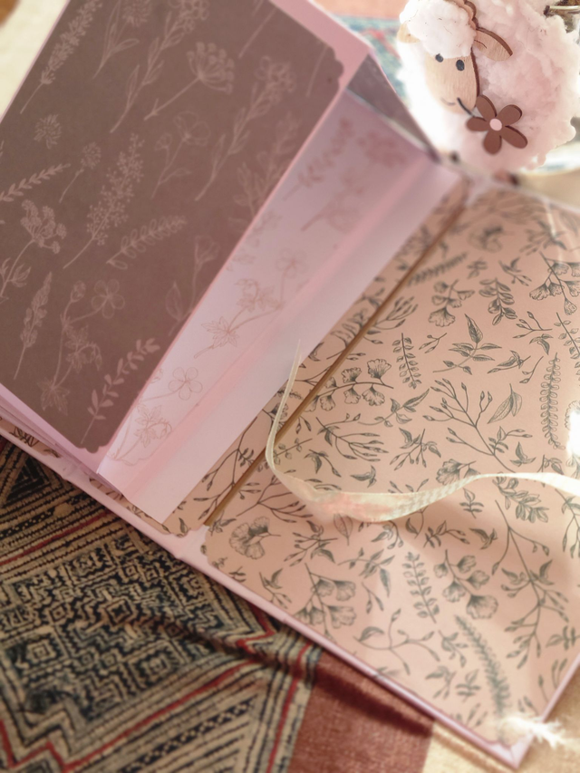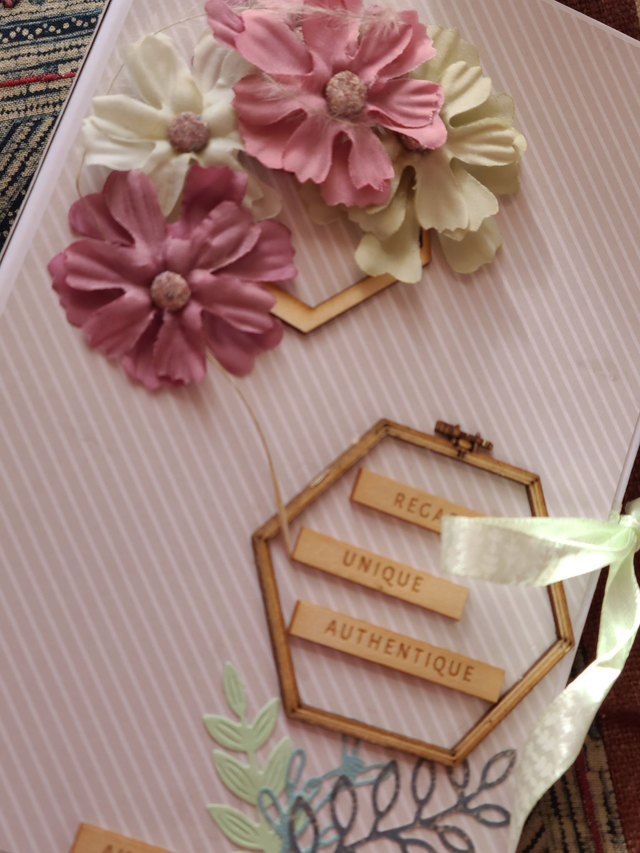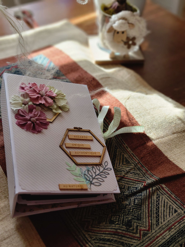 bel album pour une randonnée mémorable. Couleurs de la nature et motifs printaniers et floraux. Fait-main 22 photos au minimum. Papiers de la marque craft sensations, collection botanical garden. Couverture en cartonnette travaillée en 3 D avec des fleurs en tissu et des embellissements en bois. Reliure en U et fermeture par ruban. h 20* l 13.5 cm