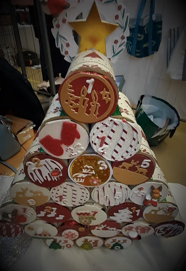 Joli petit sapin fabriqué à partir de 24 rouleaux vides solides à remplir. Le durable et l'up-recycling est au cœur de ce calendrier de l'Avent. Customisé, c'est un élément de décor qui trouvera une place dans votre intérieur pour plusieurs années. Fait-main, modèle qui peut-être reproduit sur commande avec d'autres papiers.
