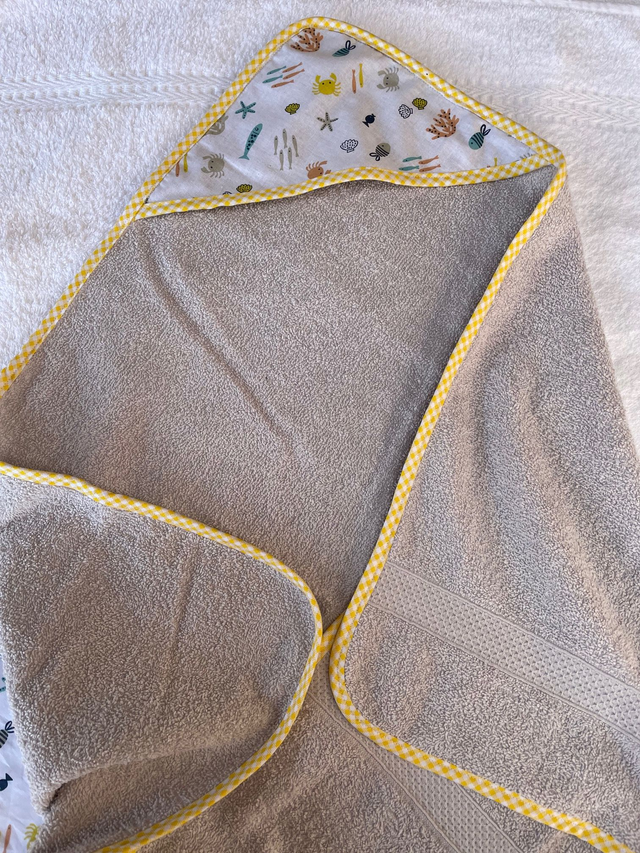 Cape de bain cousue main en coton éponge. Belles finitions. La cape a une capuche d'angle en coton imprimé doublée de coton éponge. Avec cette cape, il y a 6 lingettes lavables assorties : une face en coton imprimé, une face en coton de bambou pour la douceur de 14*14 cm.