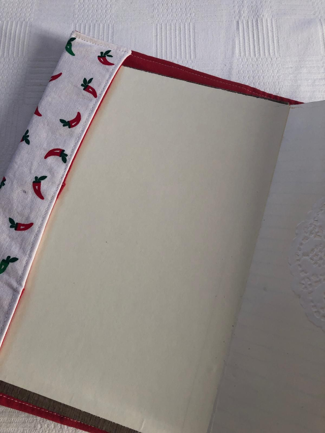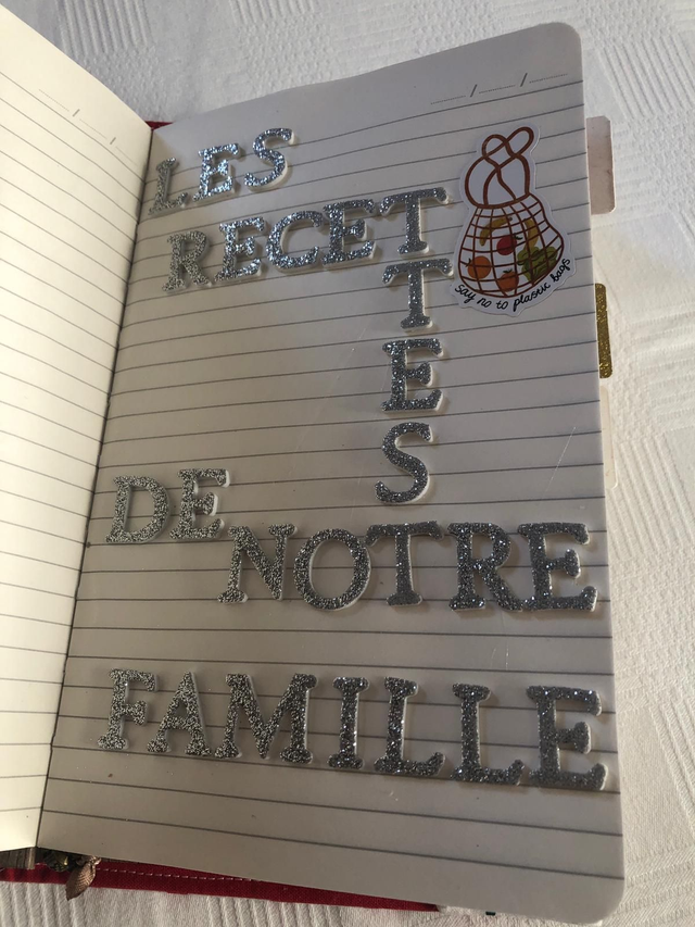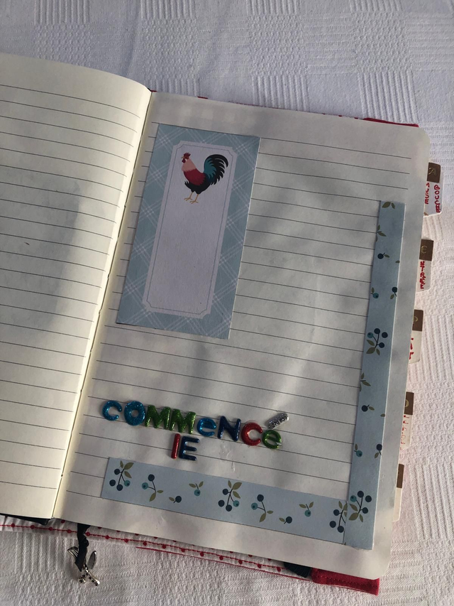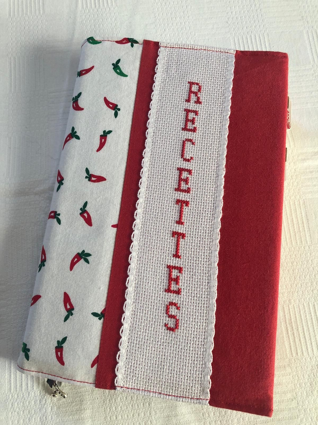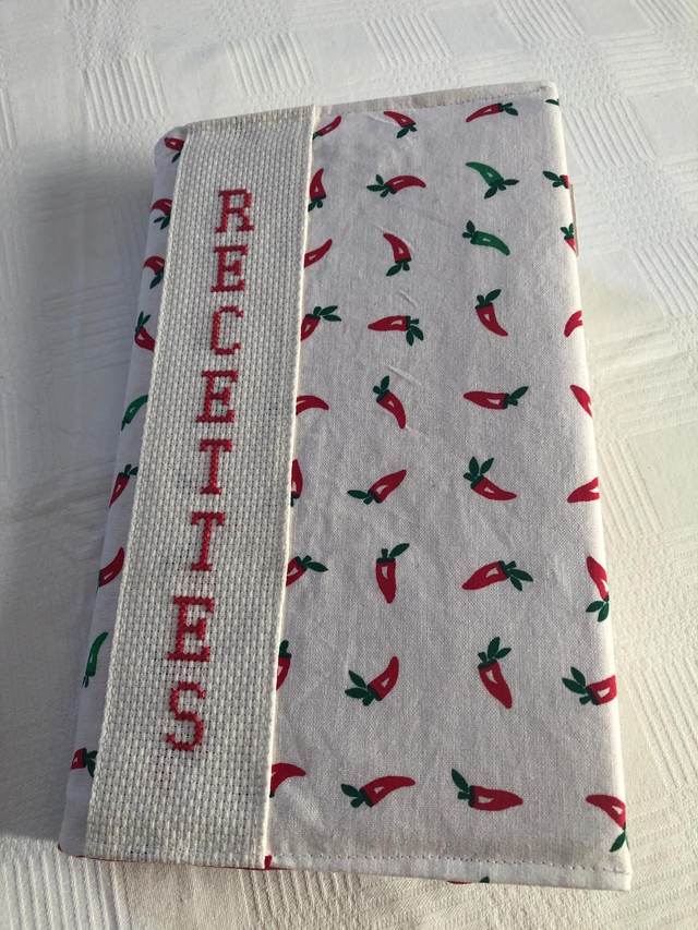 Un carnet A5 pour transmettre les recettes de famille. Les pages sont donc lignées. Une couverture en tissus avec le mot recettes brodé au point de croix réalisée par Karine. L'intérieur est customisé : 5 pages intercalaires avec des onglets, plus 2 pages au début et à la fin sur le thème de la cuisine. À offrir ou à s'offrir, à remplir ou à faire remplir. Une belle idée de transmission intergénérationnelle qui permet de partager les souvenirs, notamment si vous collez des photos, et la culture familiale. Le cadeau interactif idéal en cette saison de retrouvailles familiales. Travail de qualité, grande minutie, et objet durable, solidité et couverture lavable. Touche finale : un marque-page avec une breloque cuisine