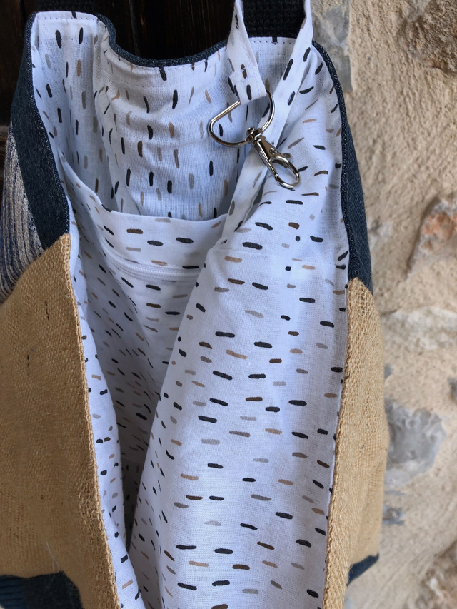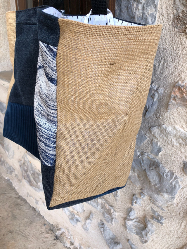 Ce grand cabas fait-main est une pièce unique. Il est composé de carrés de Jeans recyclés, de velours et de tissu jacquard. Les carrés sont assemblés par une technique de patchwork. Très belles finitions. Les côtés latéraux sont en toile de jute.