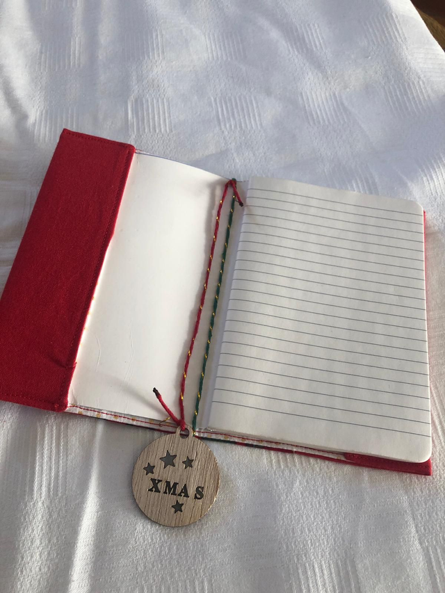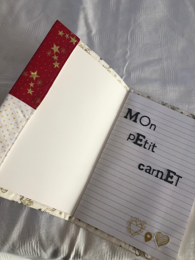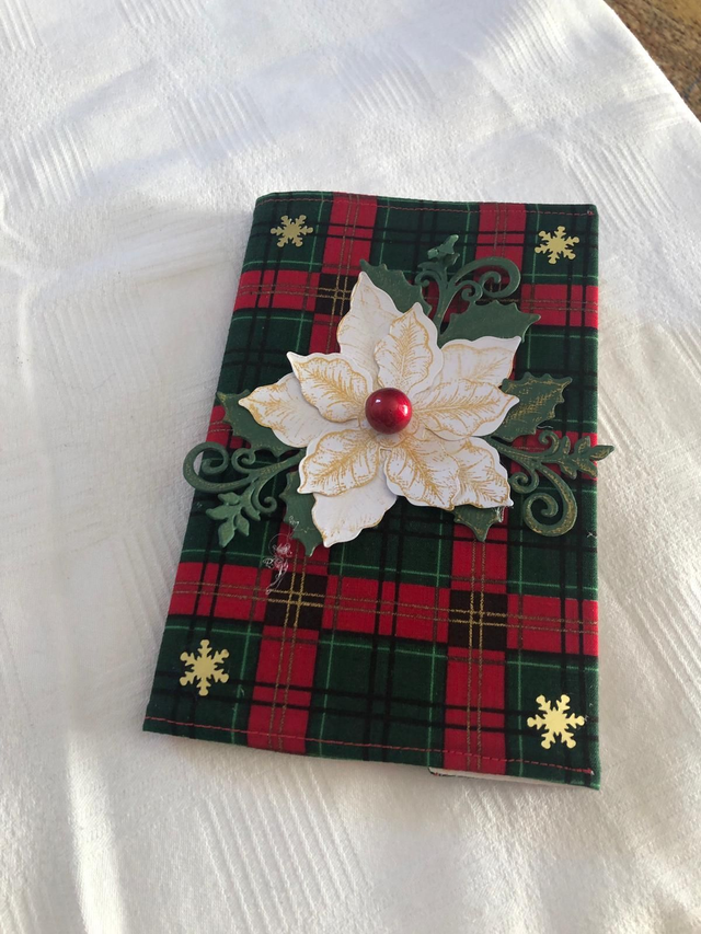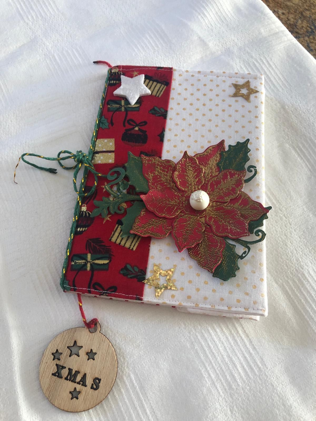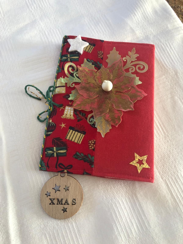 Un petit carnet de notes, petits souvenirs, petites pensées, journal intime... avec une couverture en tissus faite main par Karine et customisé avec au moins un poinsettia. Le poinsettia est fait-main par Catherine en papier ou en velum, encré ou/ et tamponné, 1ere page customisée ou avec un marque page flocon. Il y en a pour toutes les envies, 5 versions différentes. La couverture est récupérable en remplaçant le premier petit carnet terminé. Carnet de 15 à 20 pages;