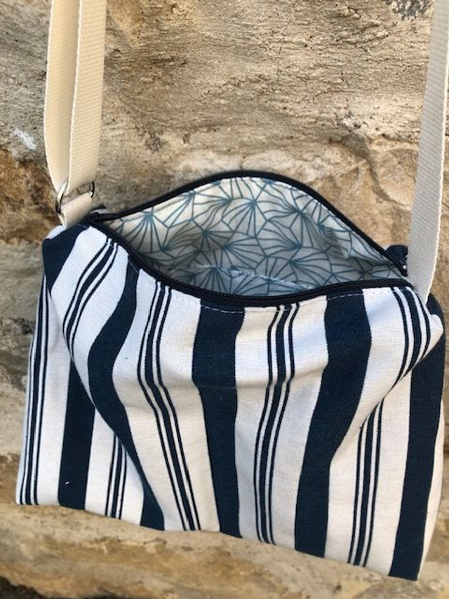 Joli petit sac en tissu jacquard rayé à porter en bandoulière avec sa sangle réglable. Ce sac est doublé en