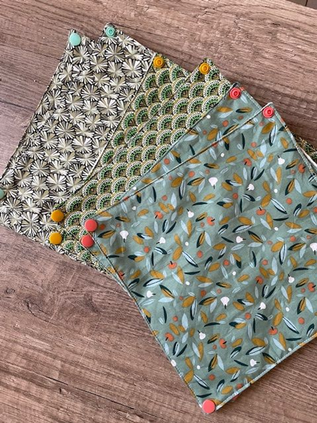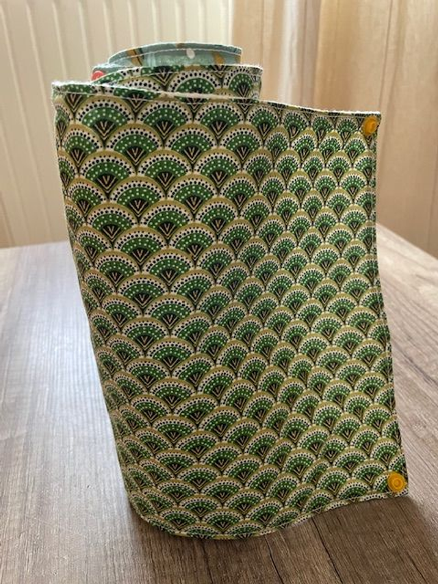 Essuie-tout lavables : passez au zéro déchet. Lot de 6 essuie-tout lavables : une face en coton nid d'abeilles et une face en coton imprimé. Les carrés peuvent être attachés entre eux et fixés sur un support à rouleau d'essuie-tout grâce à des pressions en plastique. Dimensions des carrés : 24X24 cm. Poids du rouleau : 130g. Remarque : les cotons imprimés sont des chutes de tissus utilisés pour les doublures de mes sacs : "Zéro déchet".