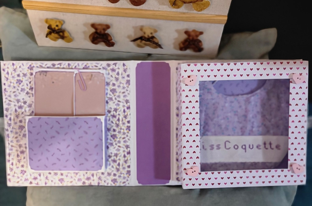 Magnifique coffret de naissance fait-main dans les tons mauve , rose et blanc pour une petite fille. La couverture a un cadre pour une photo-portrait. À l'intérieur un bavoir et un album. Le bavoir a une inscription brodée au point de croix "MISS COQUETTE" . Dans le mini-album sont prévus 12 emplacements photos pour les 12 premiers mois, plus un pour une photo naissance et un autre pour l'anniversaire des 1 an. Le baboir est dans une boite que vous pourrez utiliser pour conserver les trésors de ce petit être.